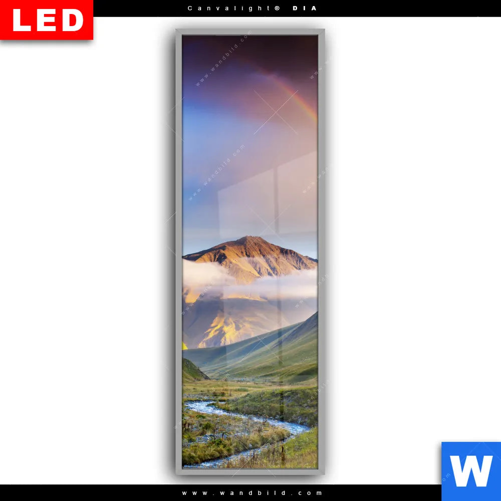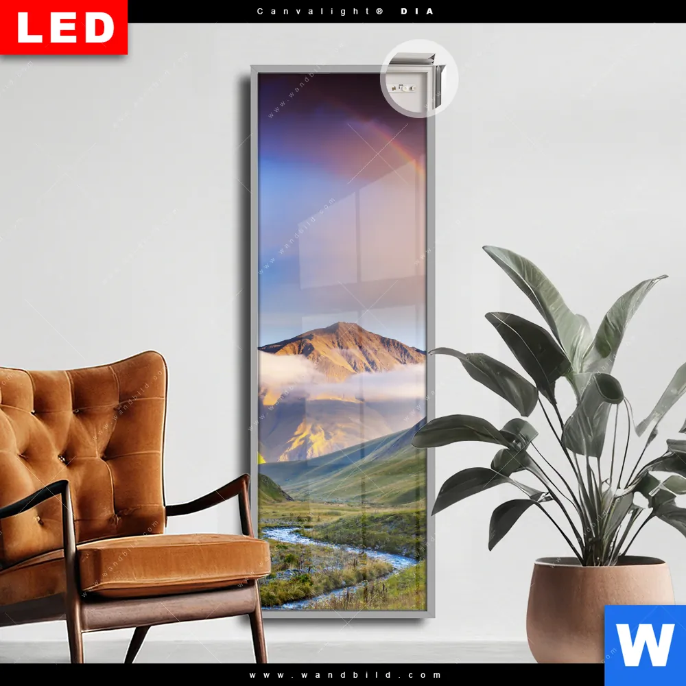 Canvalight® DIA Leuchtbild | Nebel und Regenbogen zwischen den Bergen | Schmal