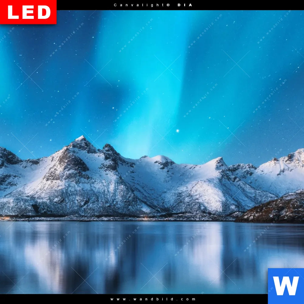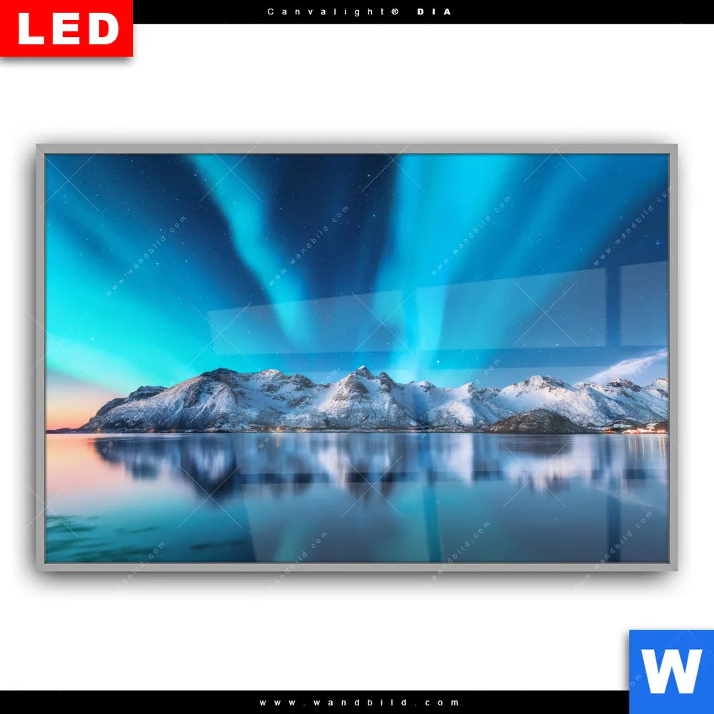 Canvalight® DIA Leuchtbild | Nordlichter und schneebedeckte Berge | Querformat