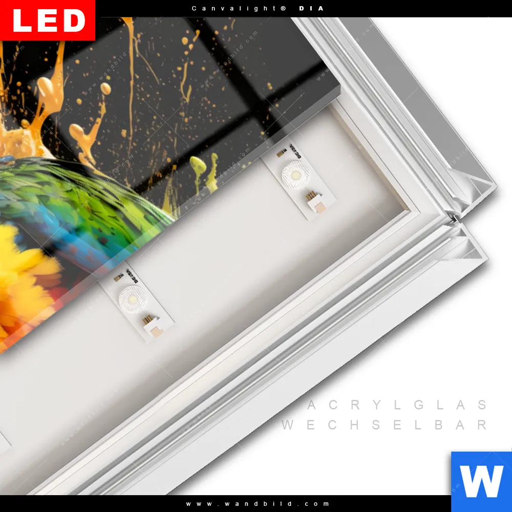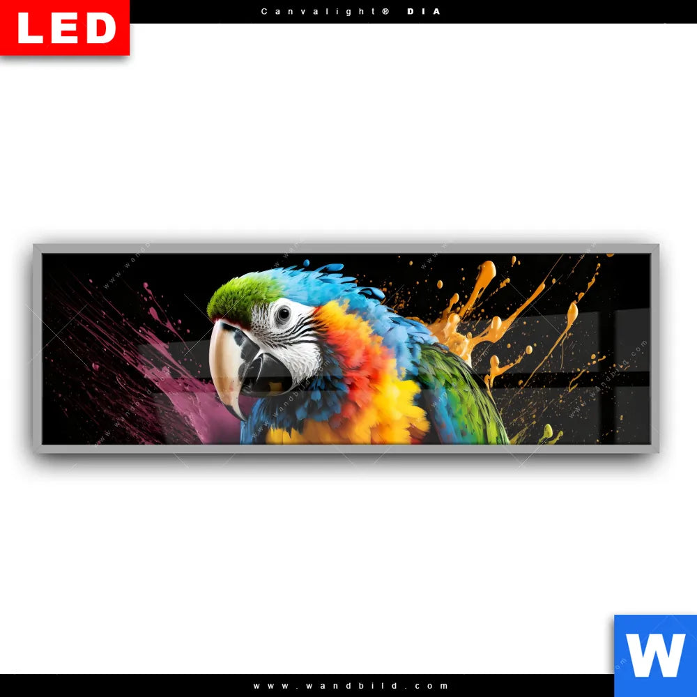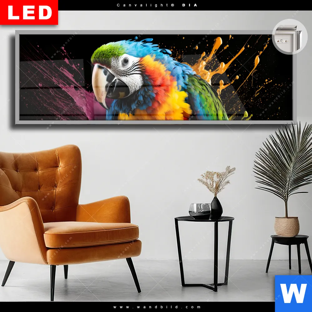 Canvalight® DIA Leuchtbild | Papagei mit bunten Farbspritzern | Panorama