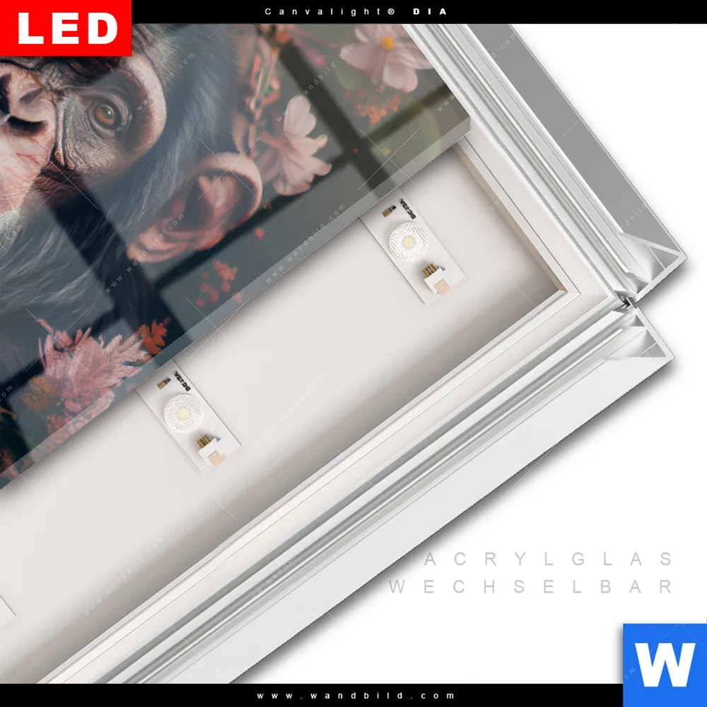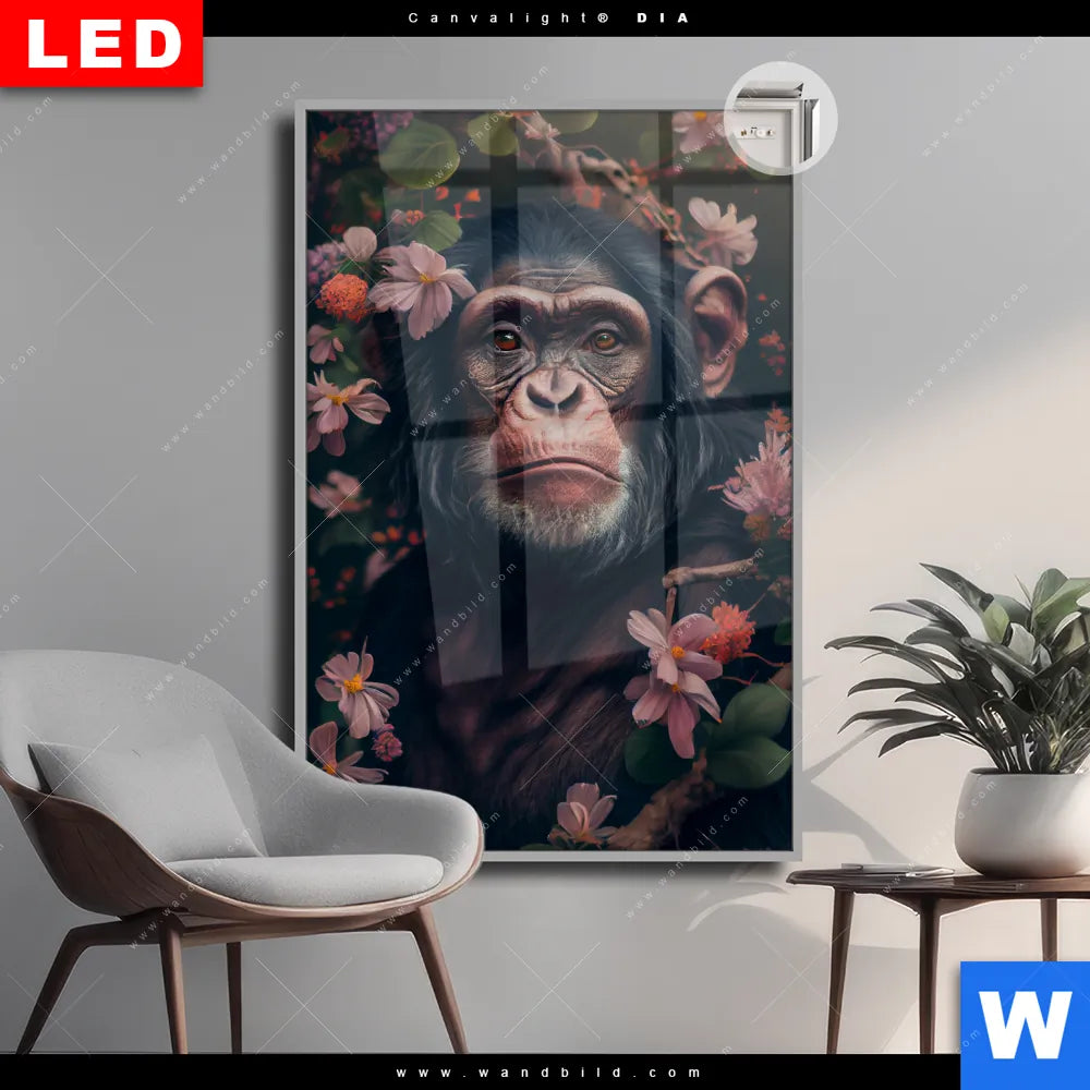 Canvalight® DIA Leuchtbild | Schimpanse zwischen Blumen | Hochformat