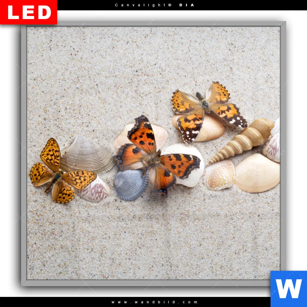 Canvalight® DIA Leuchtbild | Schmetterlinge & Muscheln im Sand | Quadrat