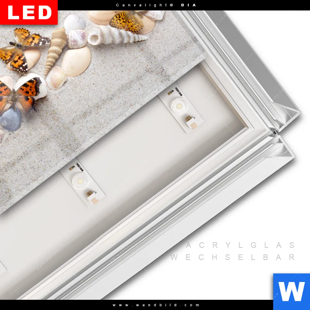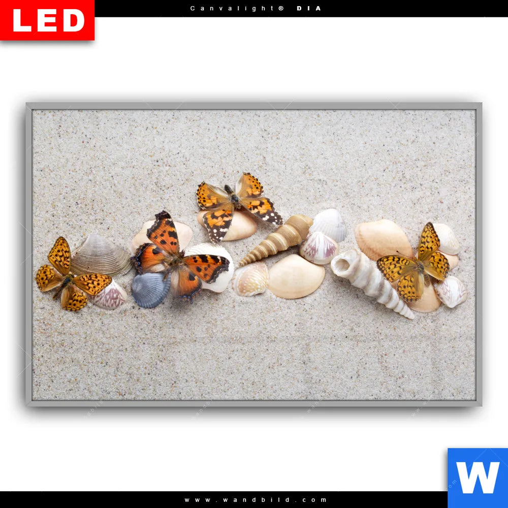 Canvalight® DIA Leuchtbild | Schmetterlinge & Muscheln im Sand | Querformat