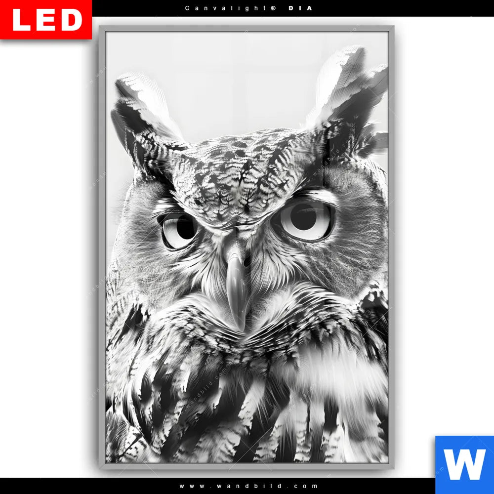 Canvalight® DIA Leuchtbild | Schwarz-Weiß Eulenportrait | Hochformat
