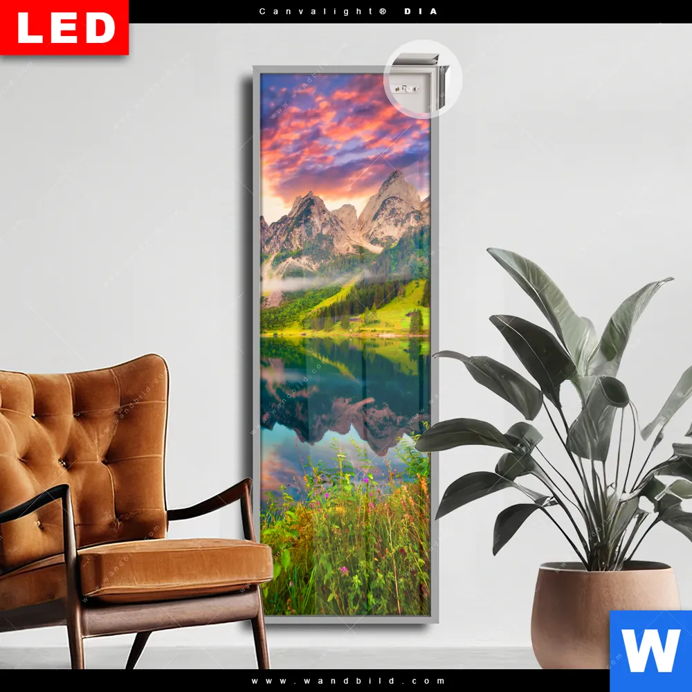 Leuchtbild Acrylglas Canvalight® DIA | Sonnenaufgang am Bergsee | Schmal