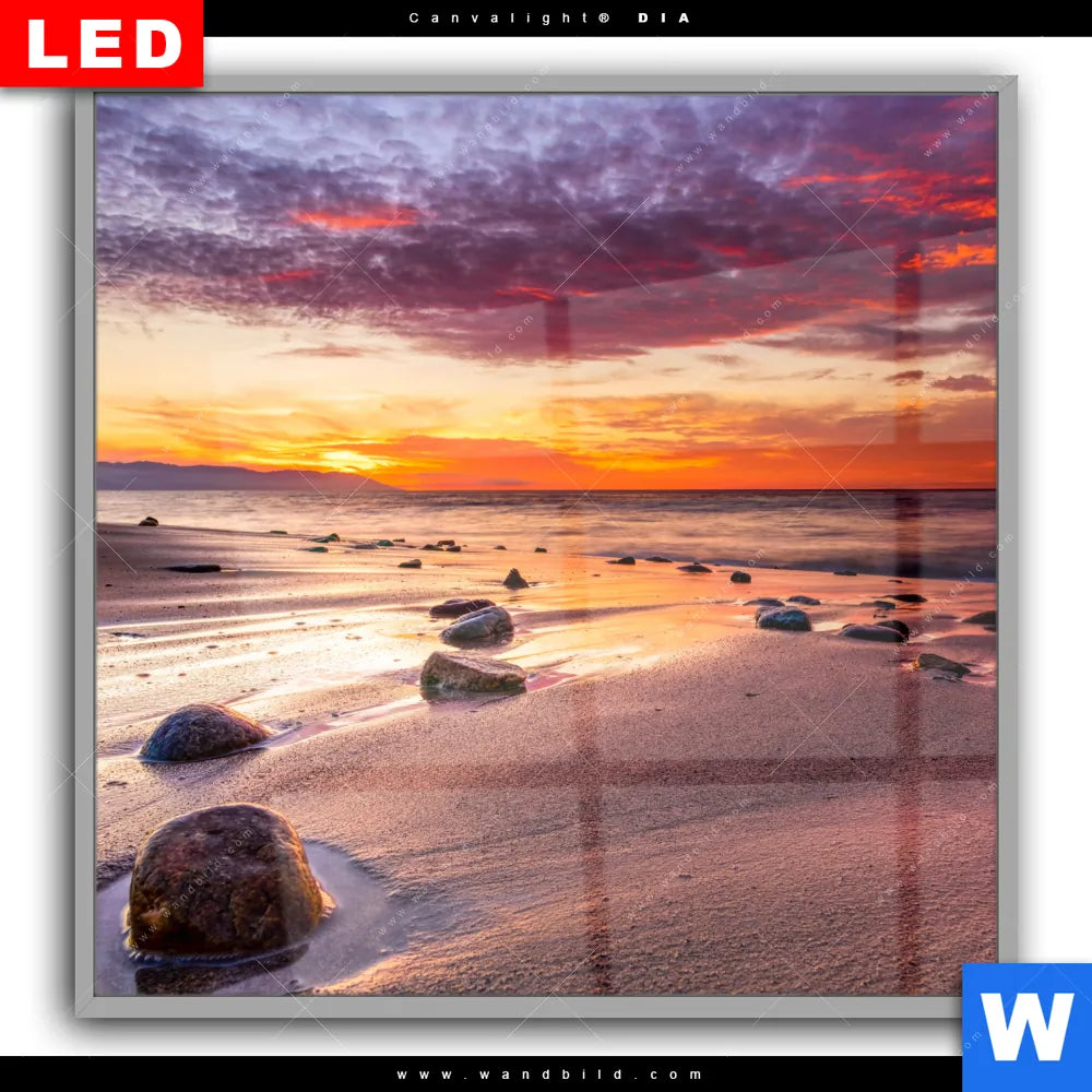Canvalight® DIA Leuchtbild | Sonnenuntergang am Strand mit Felsen | Quadrat