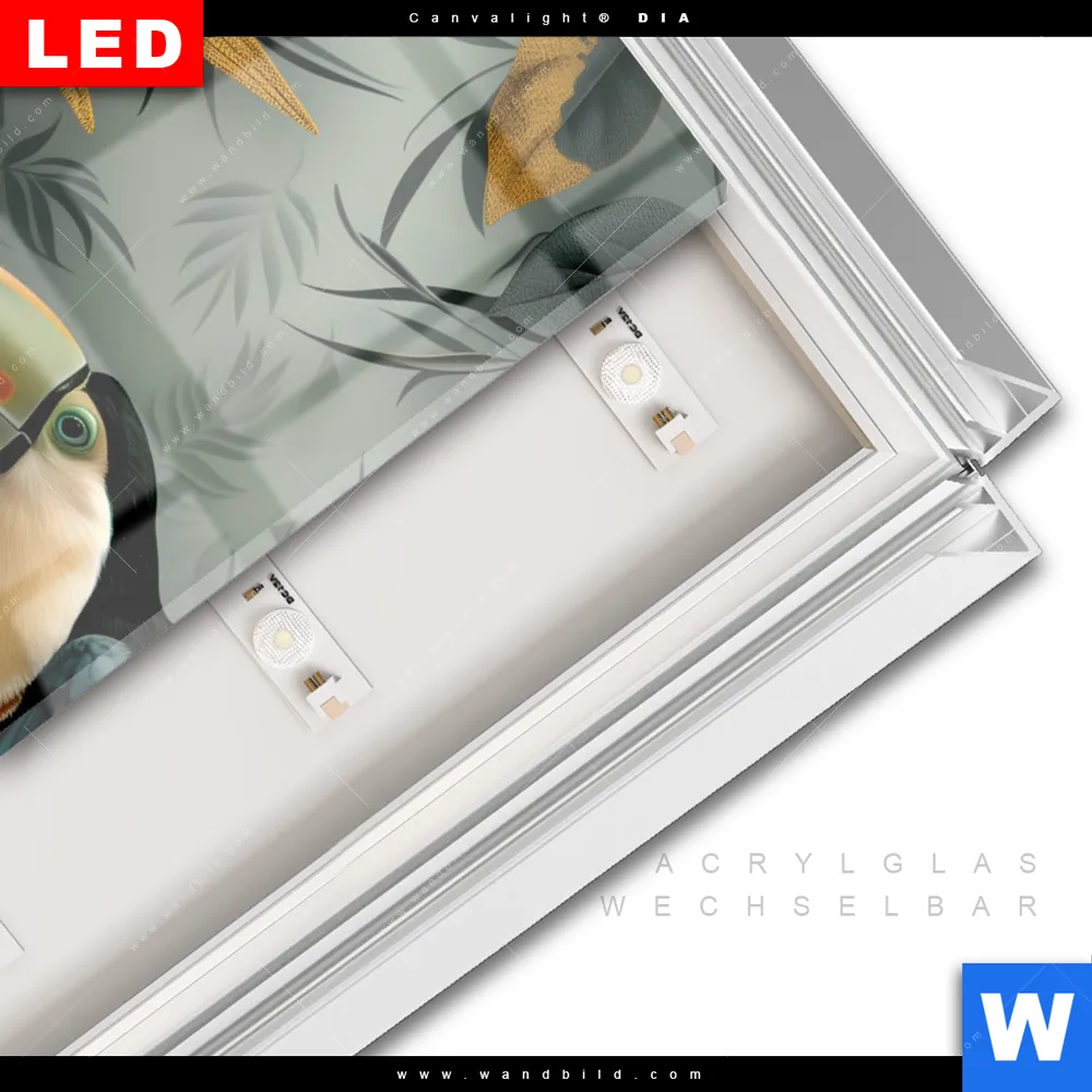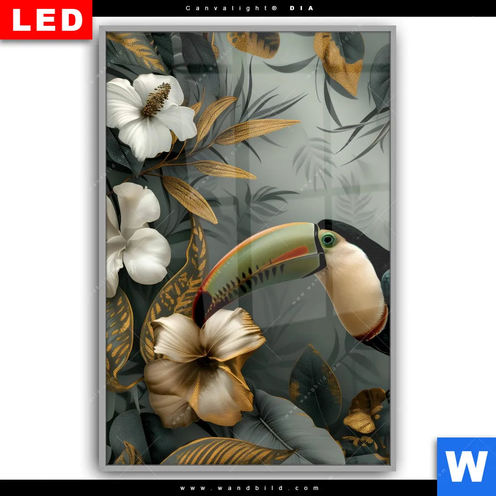 Canvalight® DIA Leuchtbild | Tukan im goldenen Regenwald | Hochformat