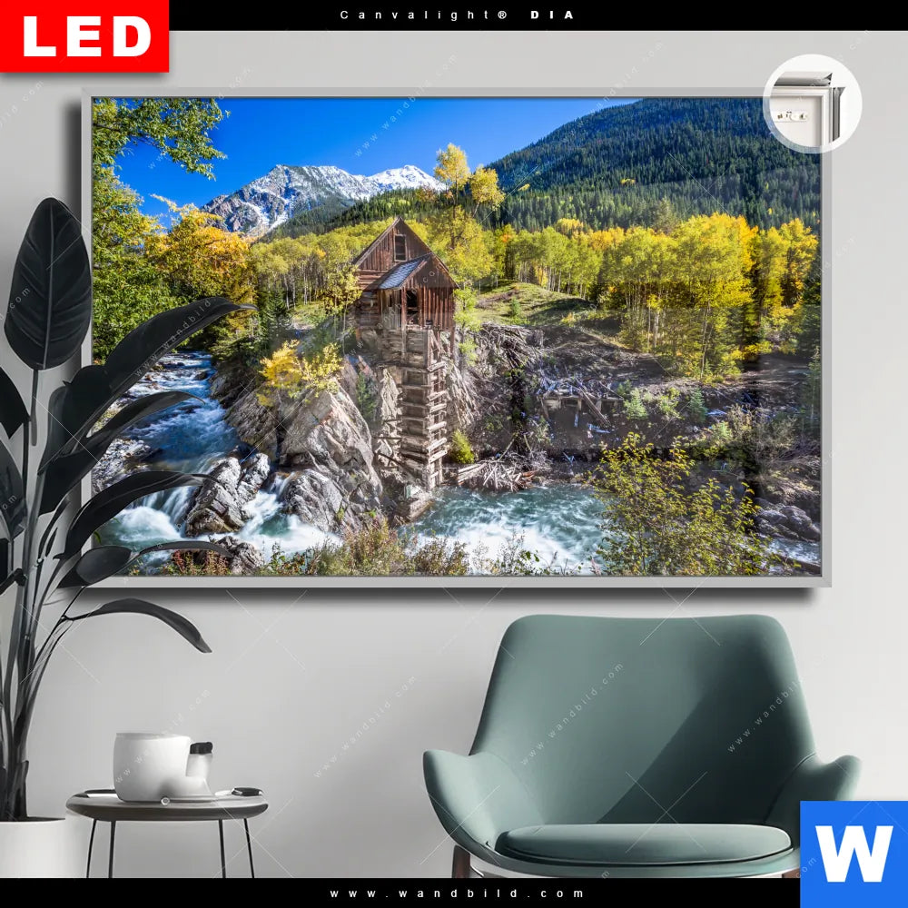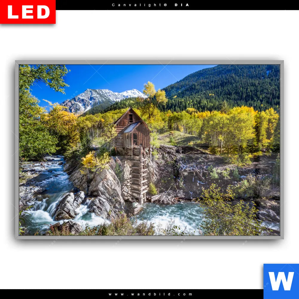 Canvalight® DIA Leuchtbild | Waldhütte am Fluss | Querformat