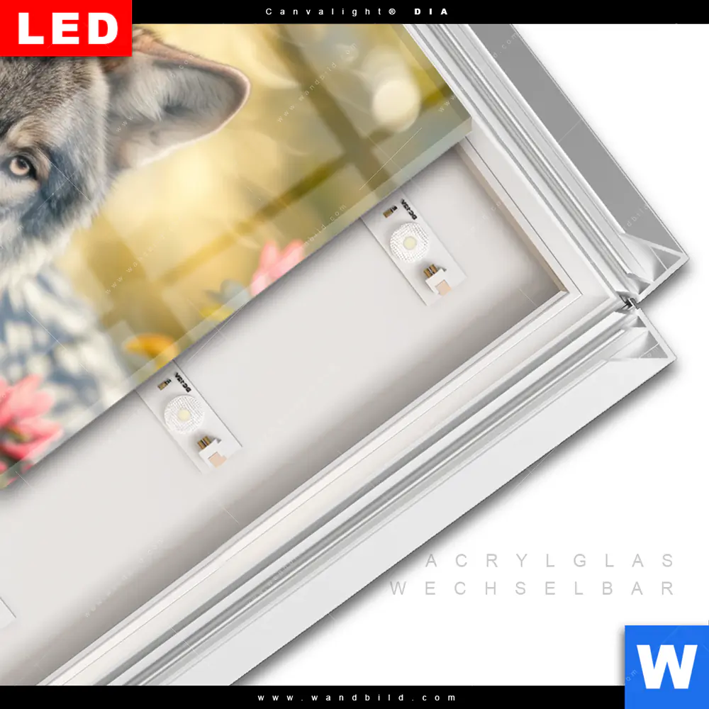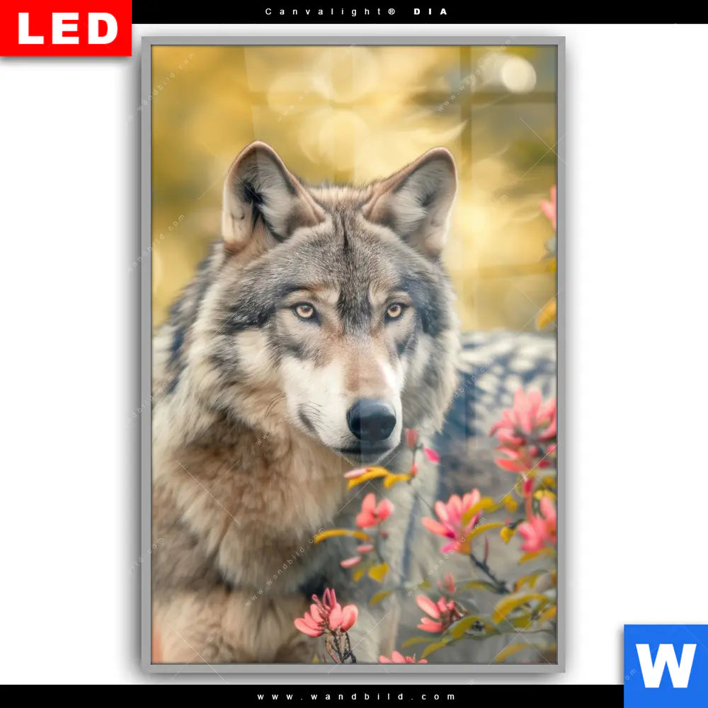 Canvalight® DIA Leuchtbild | Wolfsblick im Frühling | Hochformat