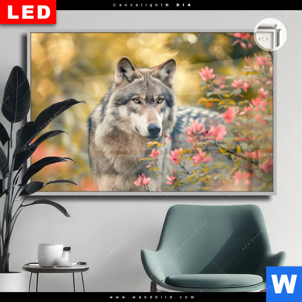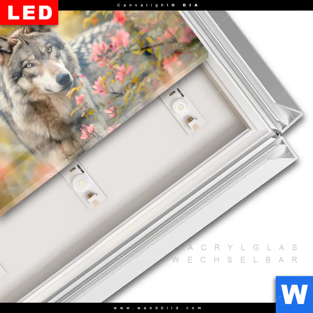 Canvalight® DIA Leuchtbild | Wolfsblick im Frühling | Querformat