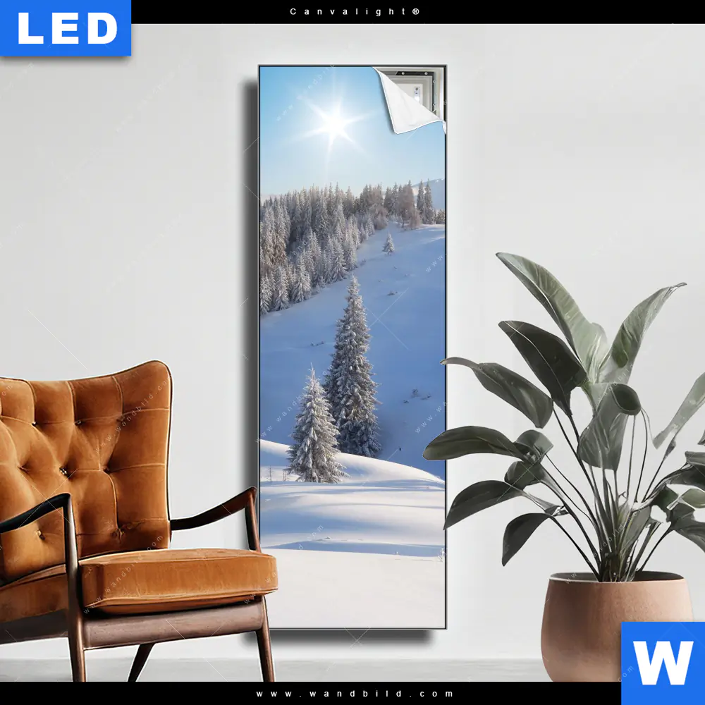 Canvalight® TEX Leuchtbild | Berge und Wälder in Schnee | Schmal