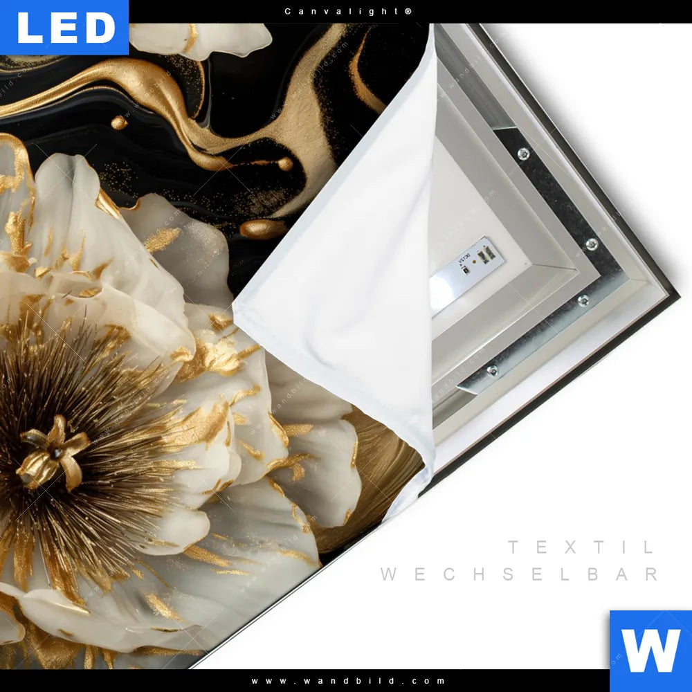 Canvalight® TEX Leuchtbild | Blüten Gold Weiß Schwarz | Quadrat