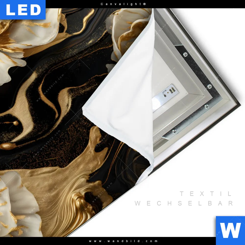 Canvalight® TEX Leuchtbild | Blüten Gold Weiß Schwarz | Querformat