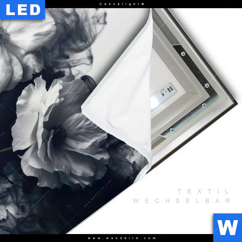 Canvalight® TEX Leuchtbild | Blumen im schwarzen Farbnebel | Querformat