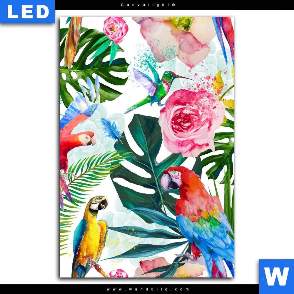 Canvalight® Leuchtbild | Blumen & Papageien Aquarell | Hochformat