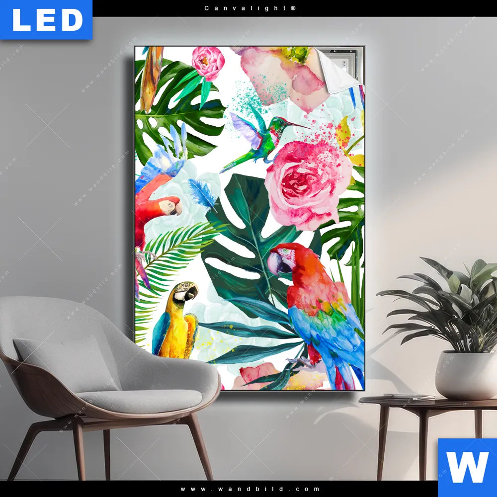 Canvalight® TEX Leuchtbild | Blumen & Papageien Aquarell | Hochformat