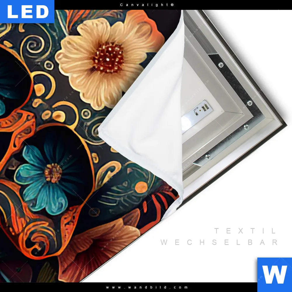 Canvalight® TEX Leuchtbild | Blumenschädel schwarz | Hochformat