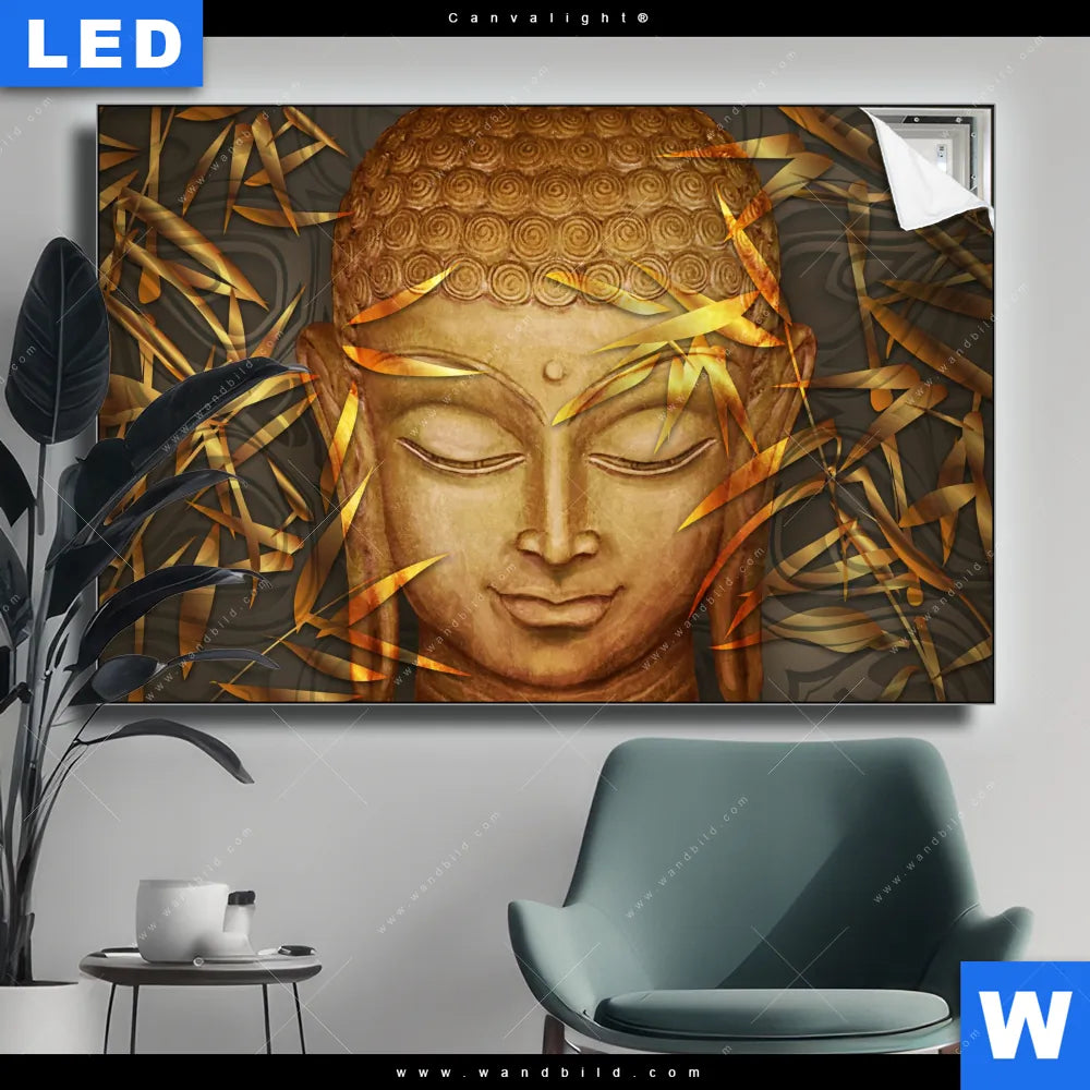 Canvalight® TEX Leuchtbild | Buddha & Bambus in Gold | Querformat