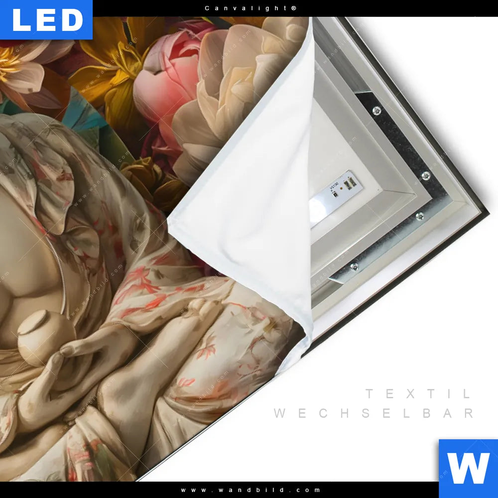 LED-Textilrahmen-Bild mit austauschbarem Buddha - Feng Shui, Blumen - Botanik Textil-Druck (Wechselbild)