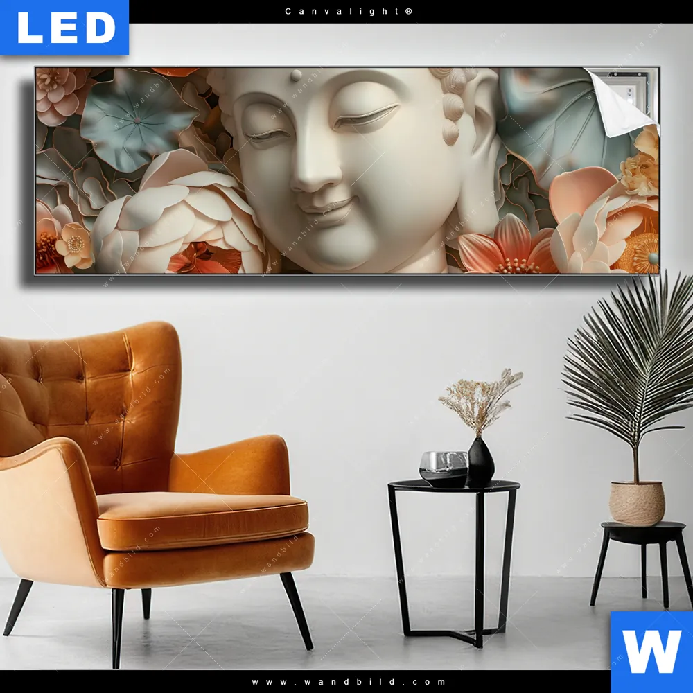 Canvalight® TEX Leuchtbild | Buddha-Statue mit Blüten | Panorama
