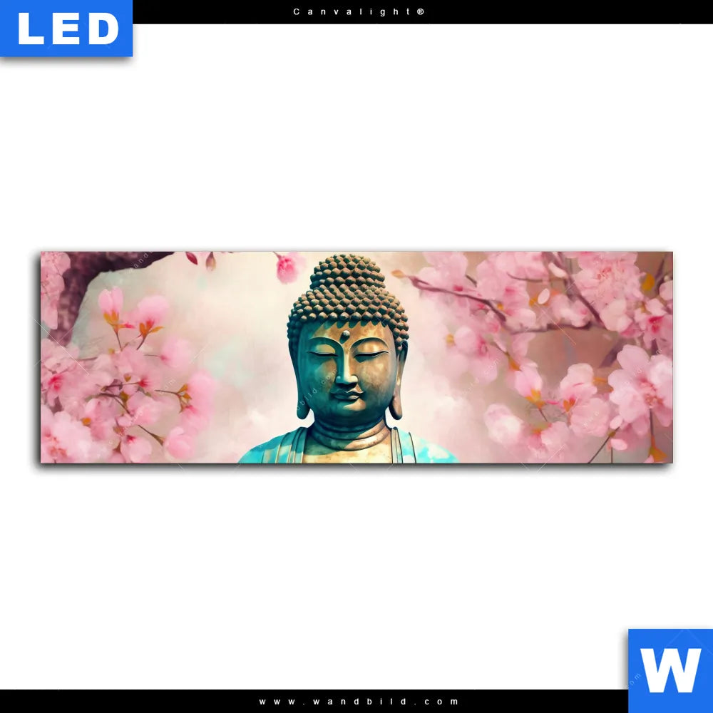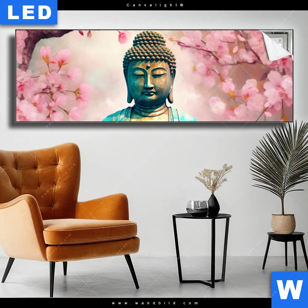 Canvalight® Leuchtbild | Buddha Statue mit Kirschblüten | Panorama