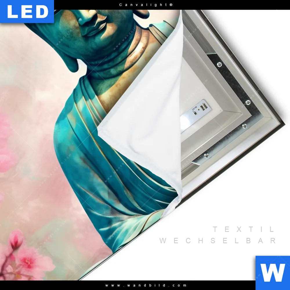 LED-Textilrahmen-Bild mit austauschbarem Buddha - Feng Shui, Blumen - Botanik Textil-Druck (Wechselbild)