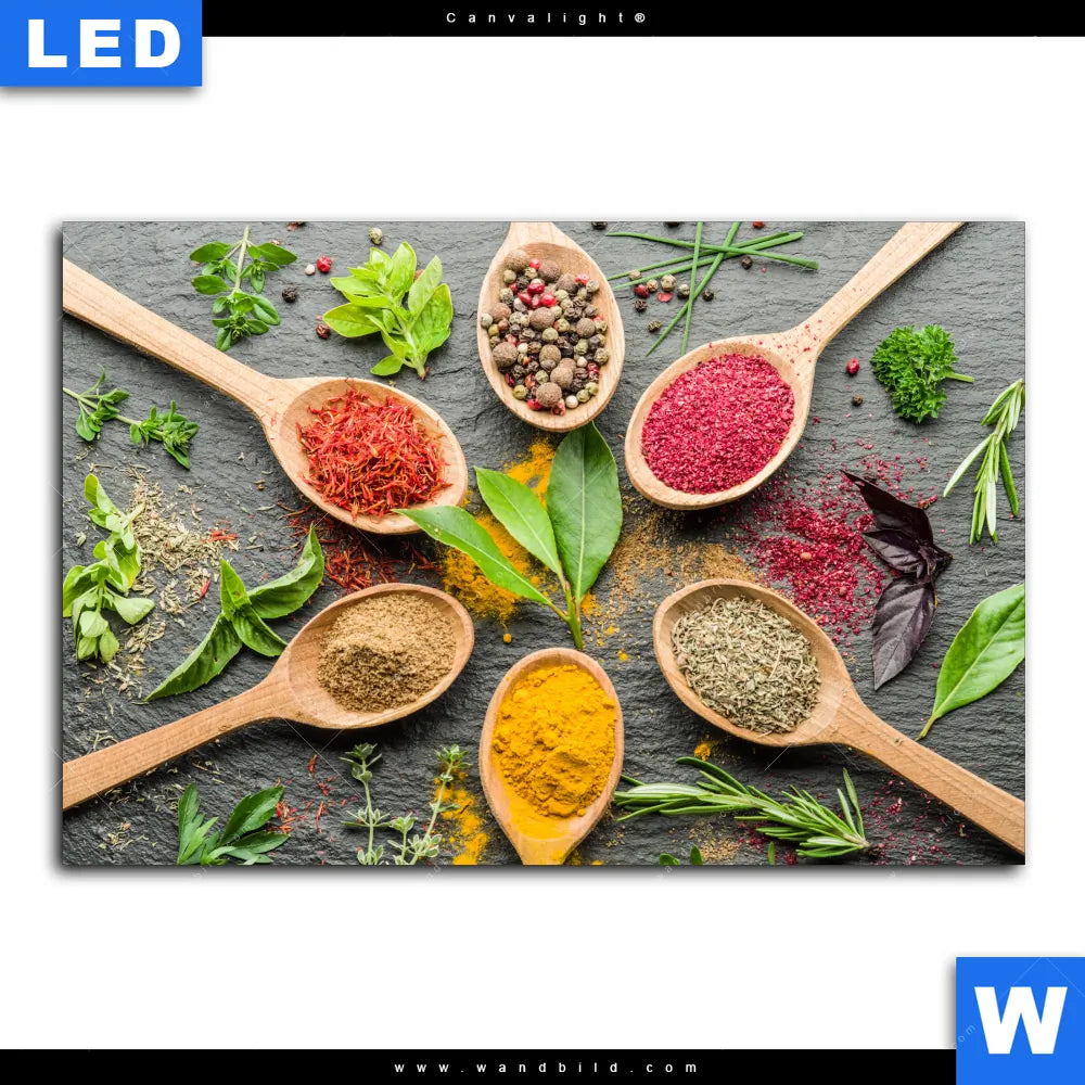 Canvalight® Leuchtbild | Bunte Gewürze in Holzlöffeln | Querformat