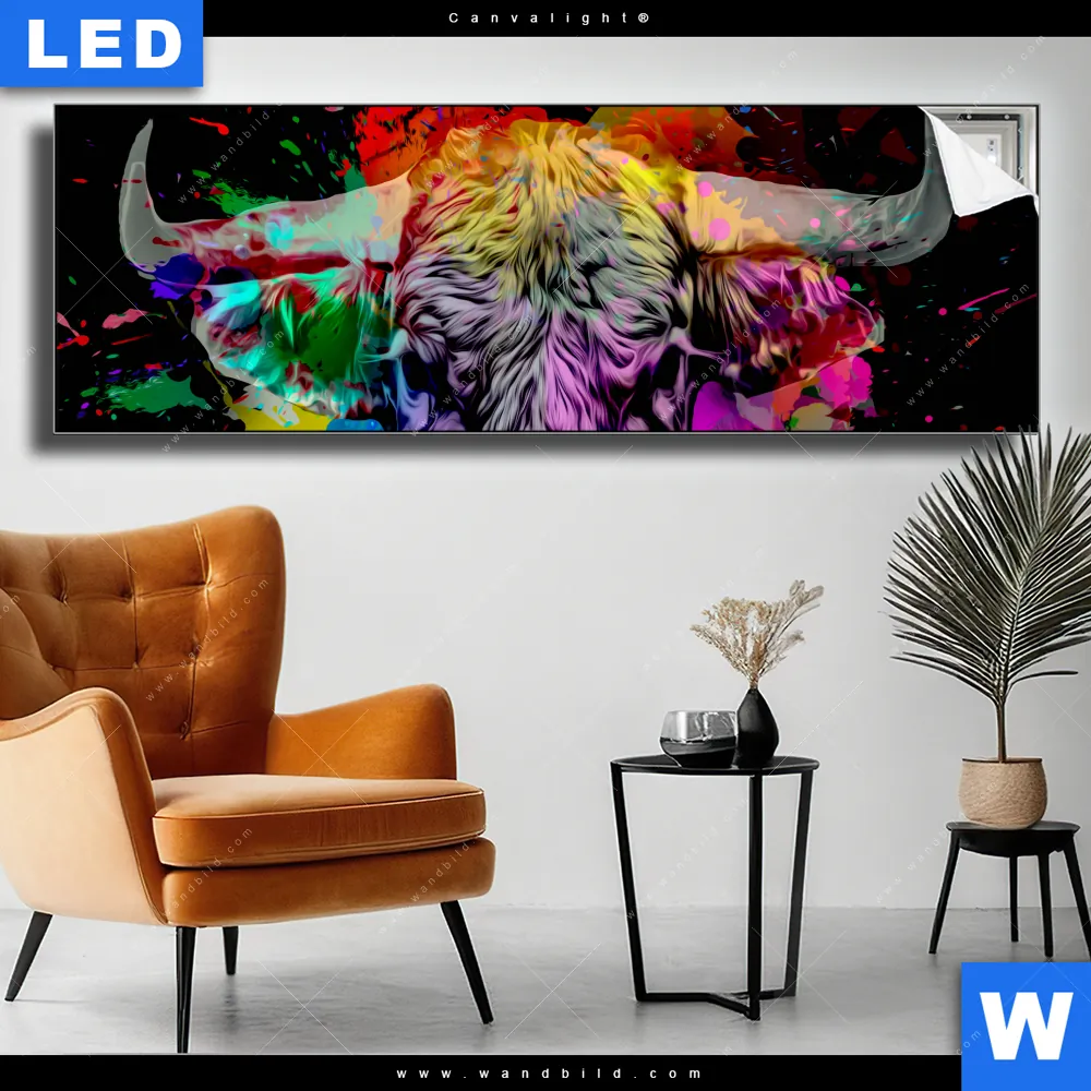 Canvalight® TEX Leuchtbild | Bunter Stier Schwarz | Panorama