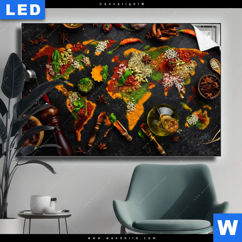 Canvalight® TEX Leuchtbild | Die Weltkarte der Gewürze | Querformat