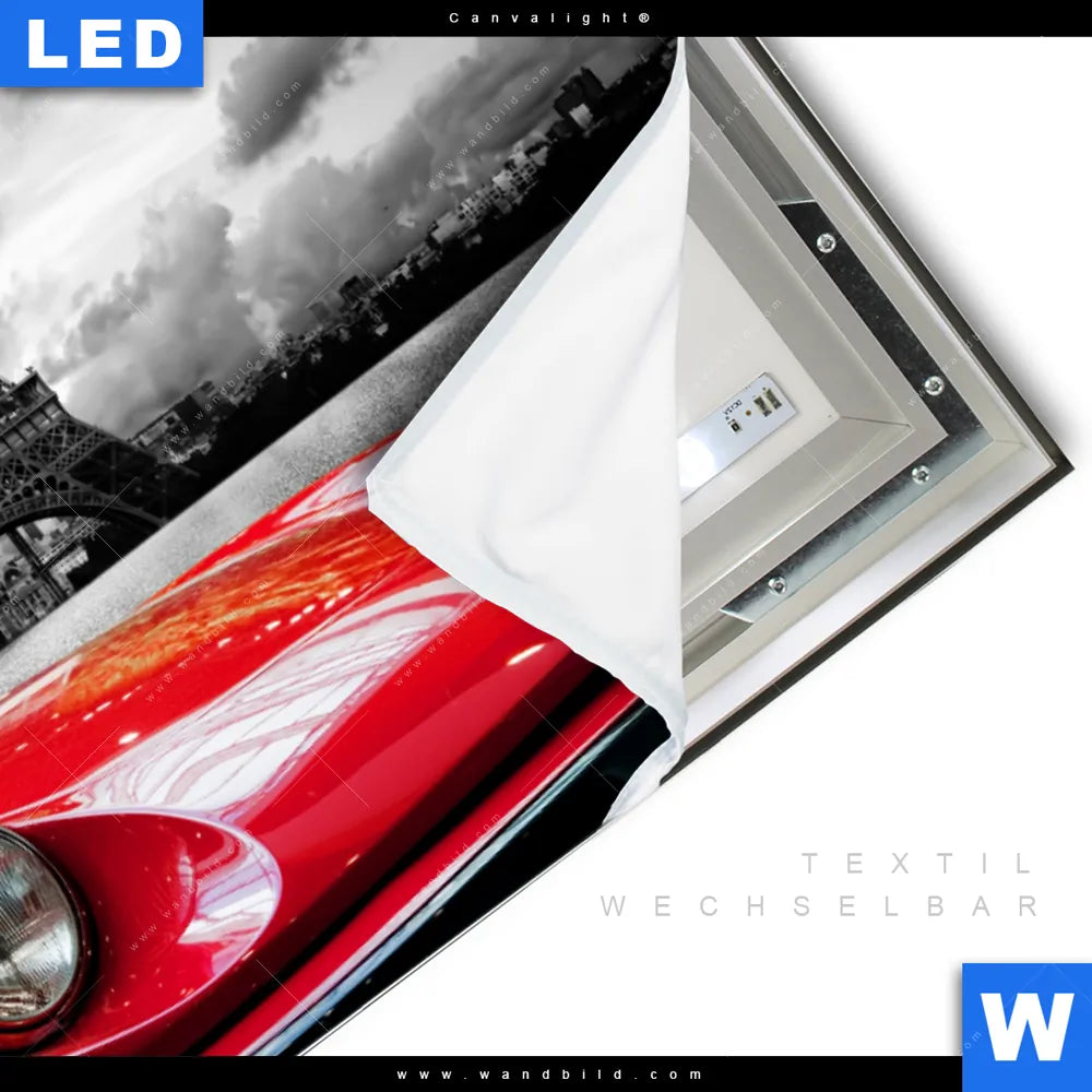 Canvalight® TEX Leuchtbild | Eiffelturm & Rotes Auto | Querformat