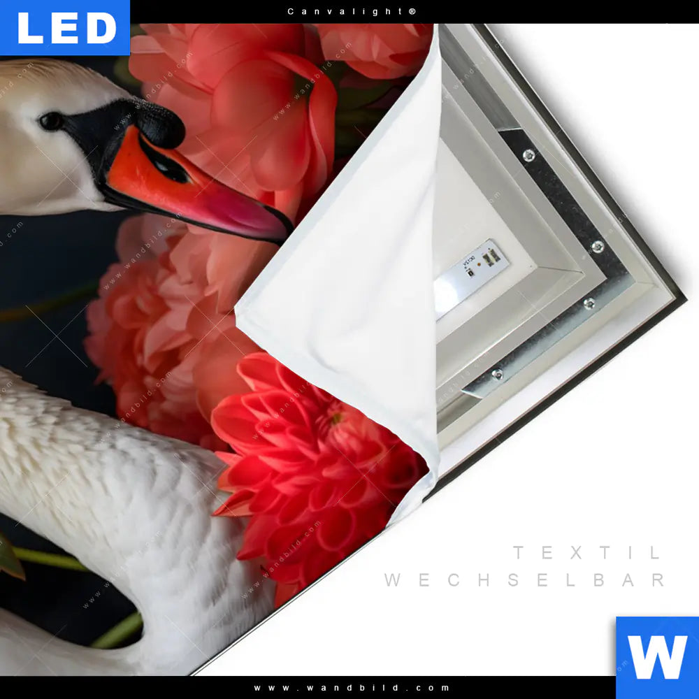 Canvalight® TEX Leuchtbild | Eleganter Schwan mit Blumen | Querformat