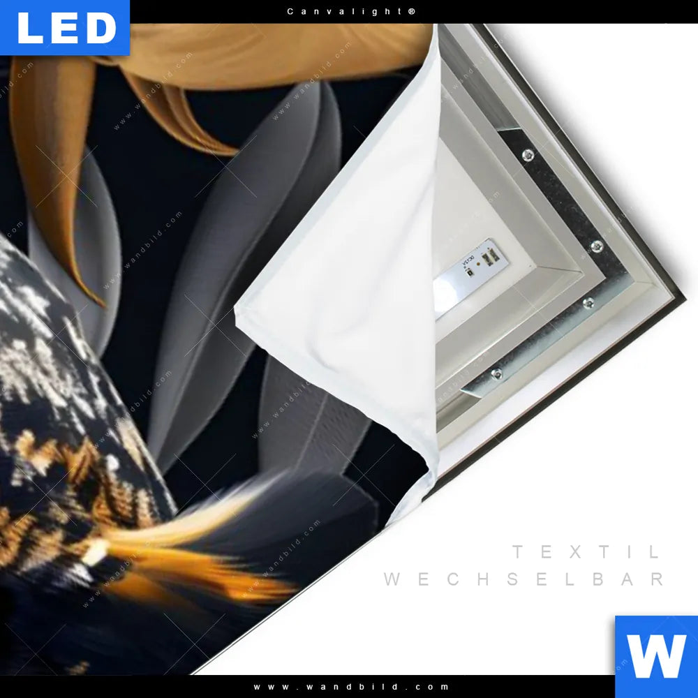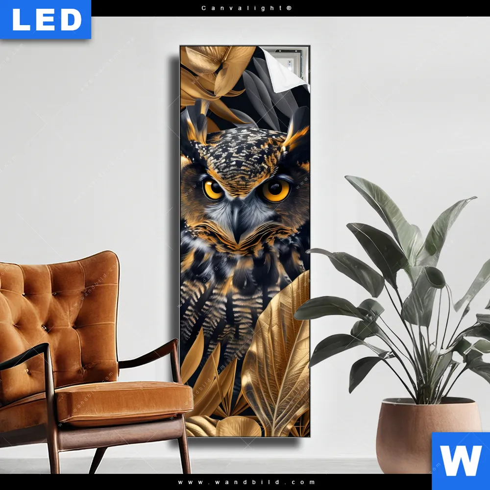 Canvalight® TEX Leuchtbild | Eule und goldene Blätter | Schmal
