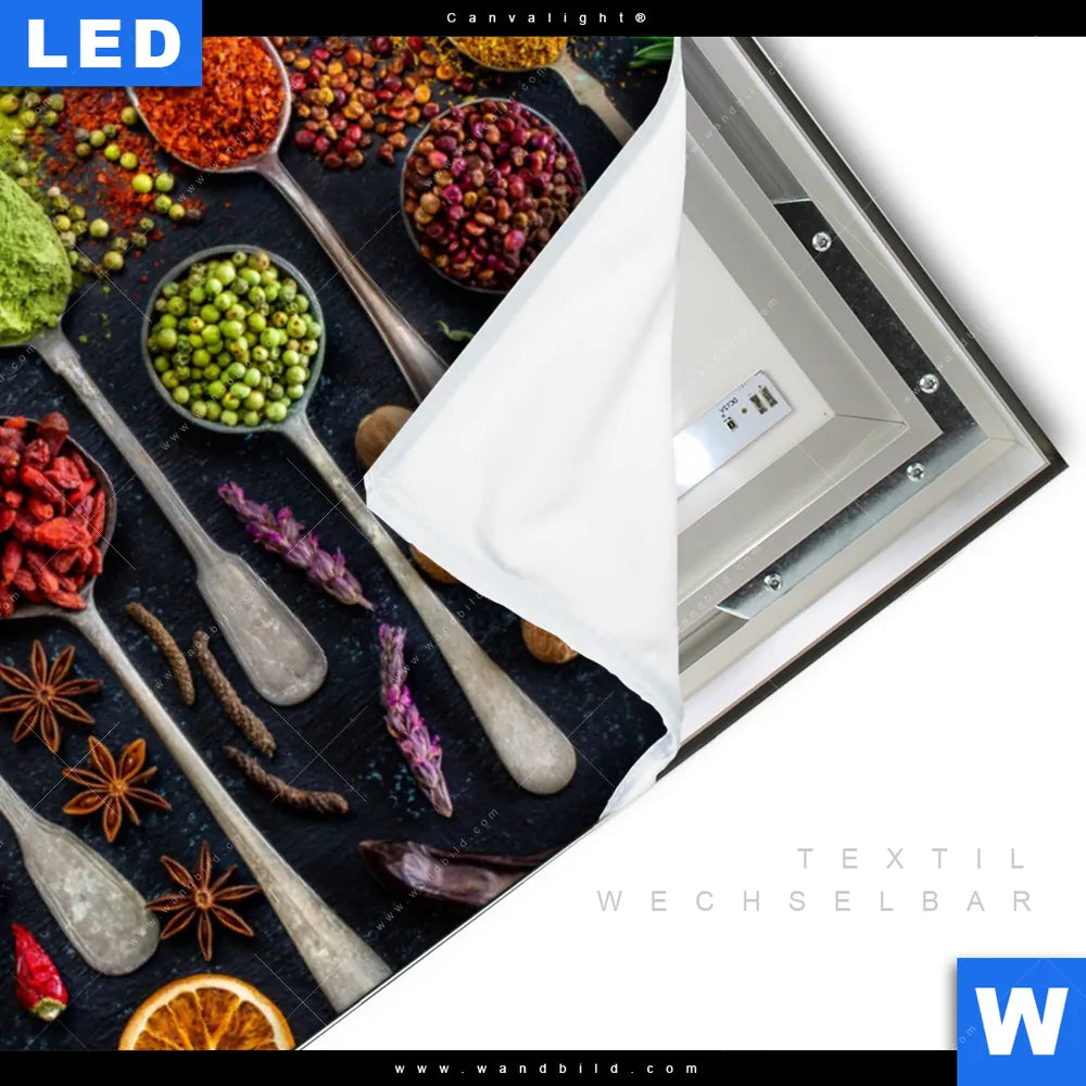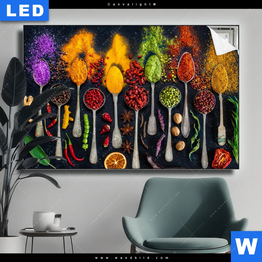 Canvalight® TEX Leuchtbild | Exotische Gewürze auf Löffeln | Querformat