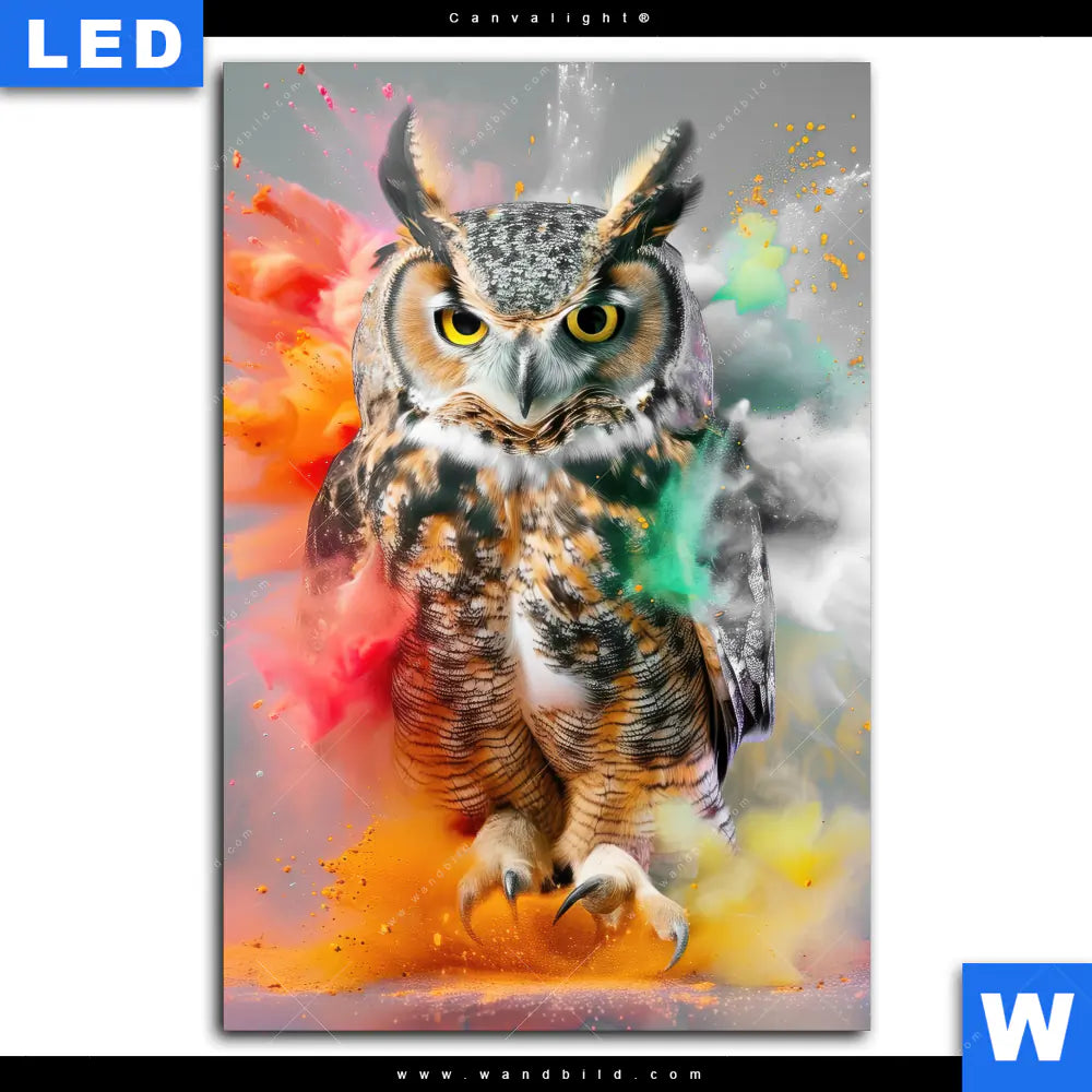 Canvalight® Leuchtbild | Farbenexplosion mit Eule | Hochformat