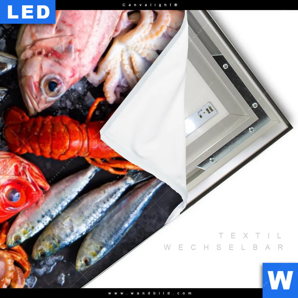 Canvalight® TEX Leuchtbild | Frischer Fisch und Meeresfrüchte | Hochformat