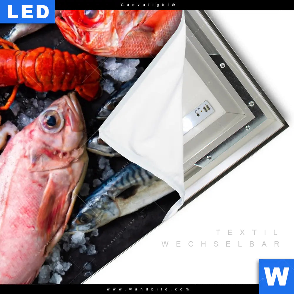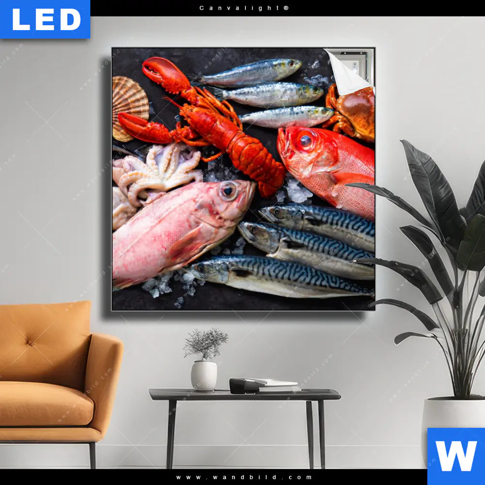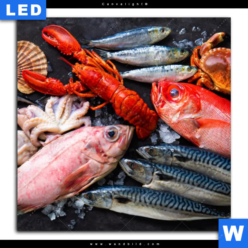 Canvalight® TEX Leuchtbild | Frischer Fisch und Meeresfrüchte | Quadrat