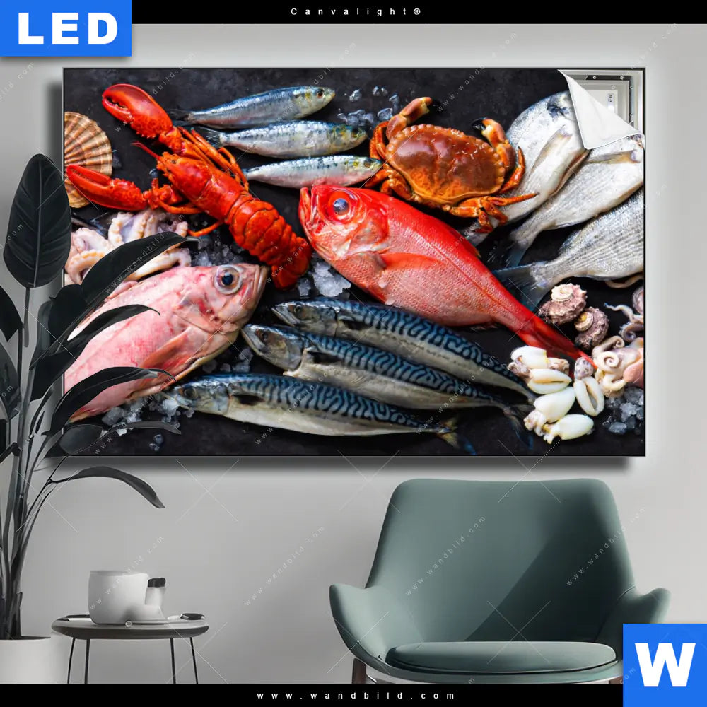 Canvalight® TEX Leuchtbild | Frischer Fisch und Meeresfrüchte | Querformat