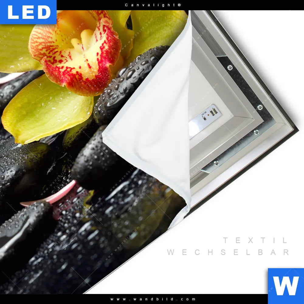 LED-Textilrahmen-Bild mit austauschbarem Buddha - Feng Shui, Blumen - Botanik Textil-Druck (Wechselbild)