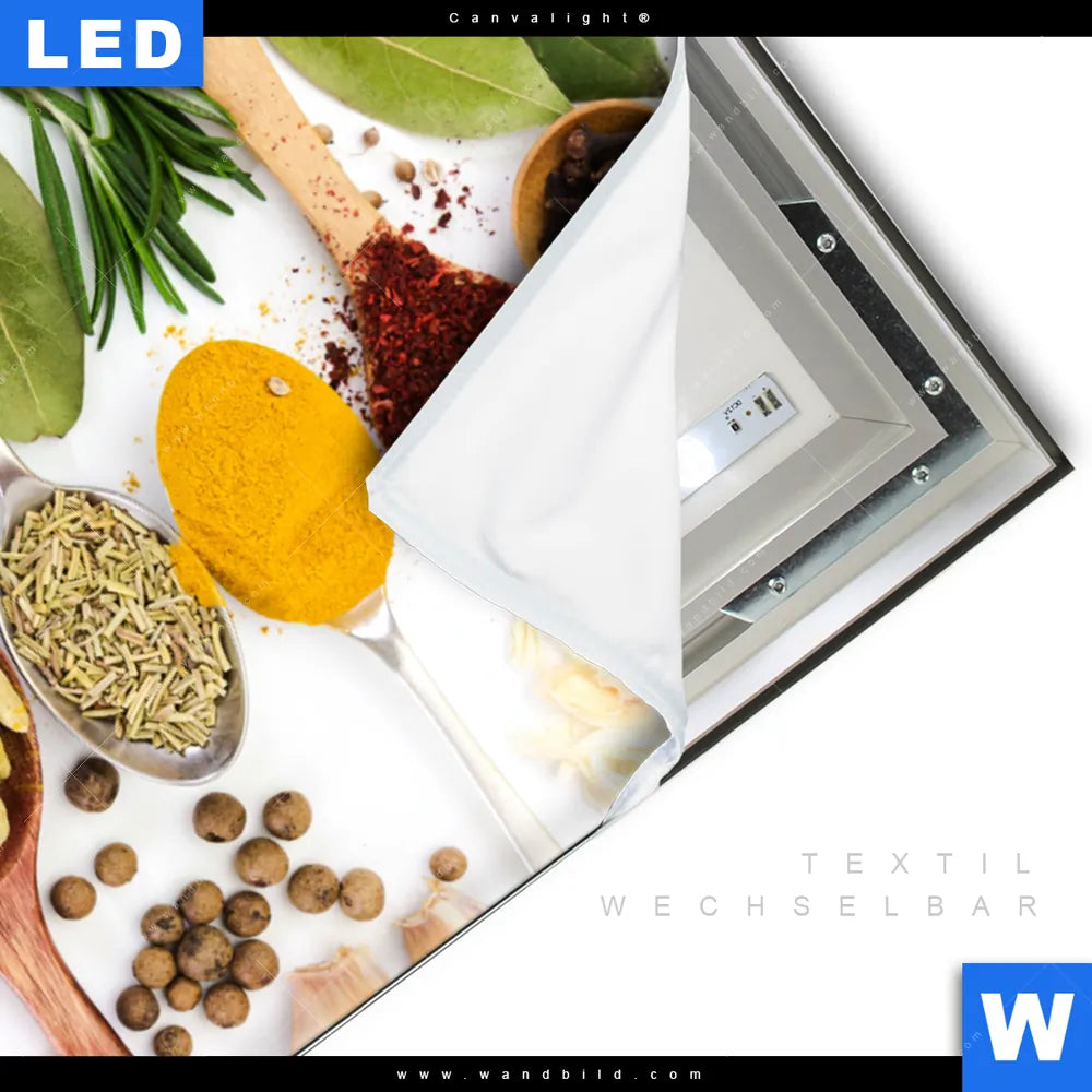Canvalight® TEX Leuchtbild | Gewürze auf Löffeln - weiß | Hochformat