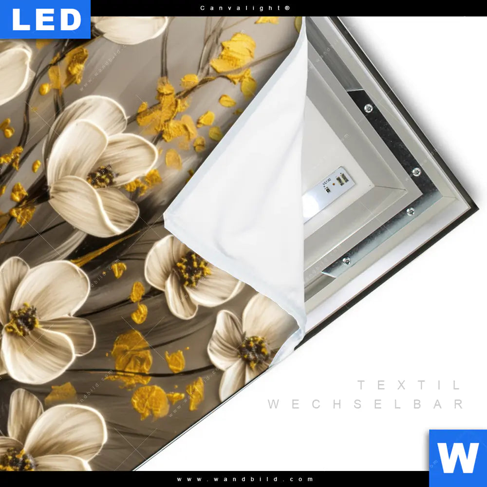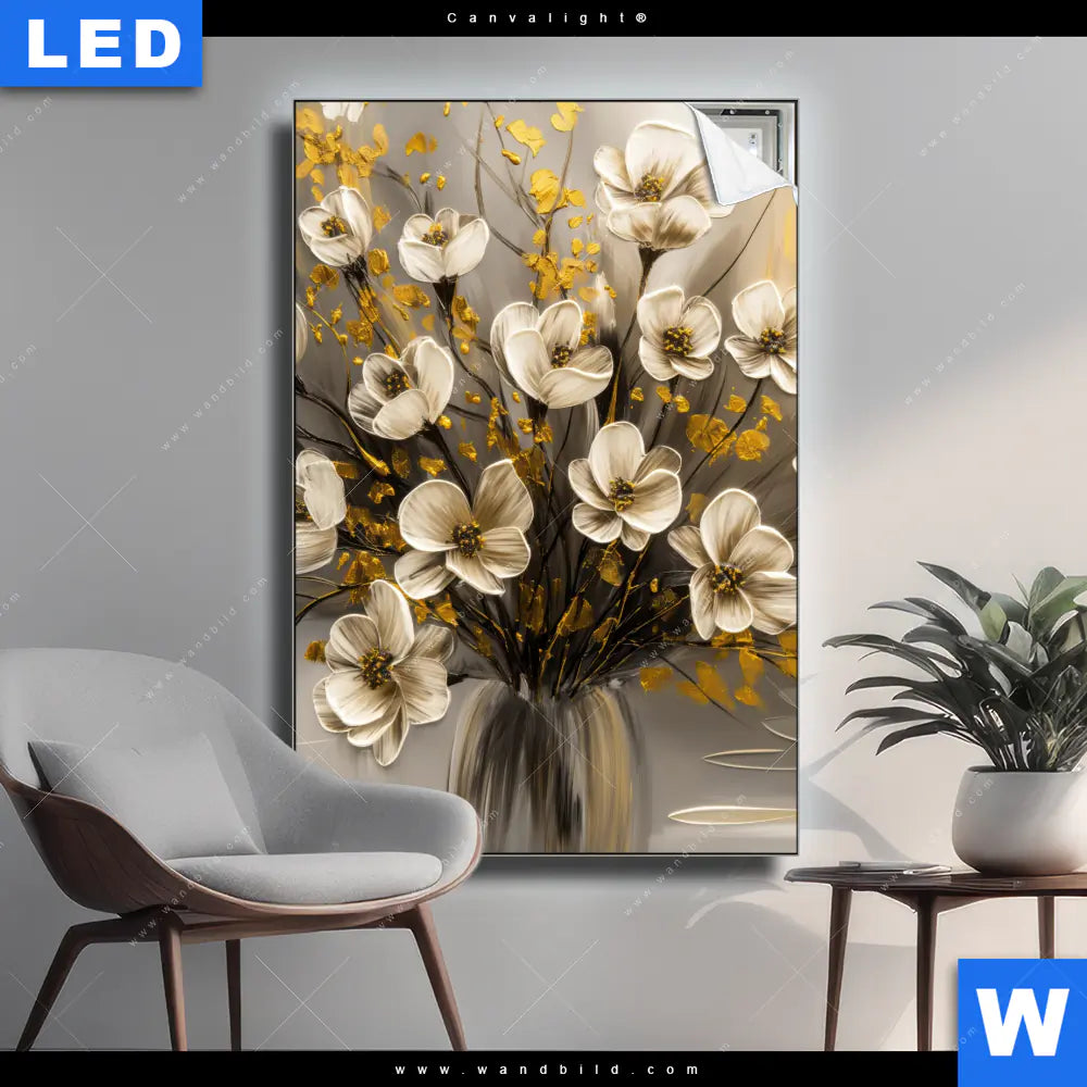 Canvalight® TEX Leuchtbild | Goldene Blütenpoesie | Hochformat