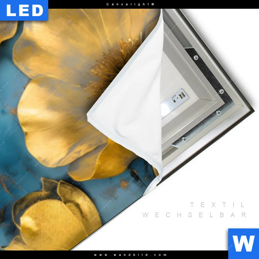 Canvalight® TEX Leuchtbild | Goldene Blumen auf Blau | Panorama