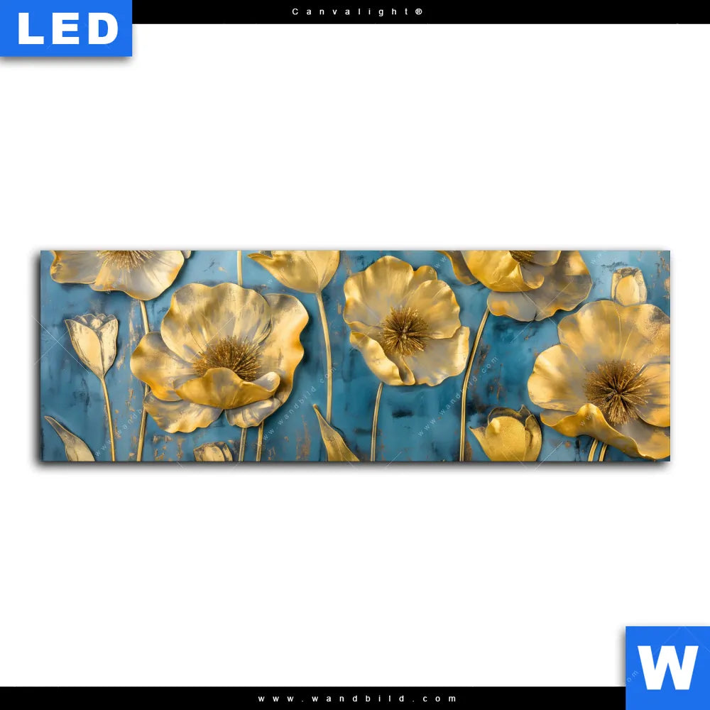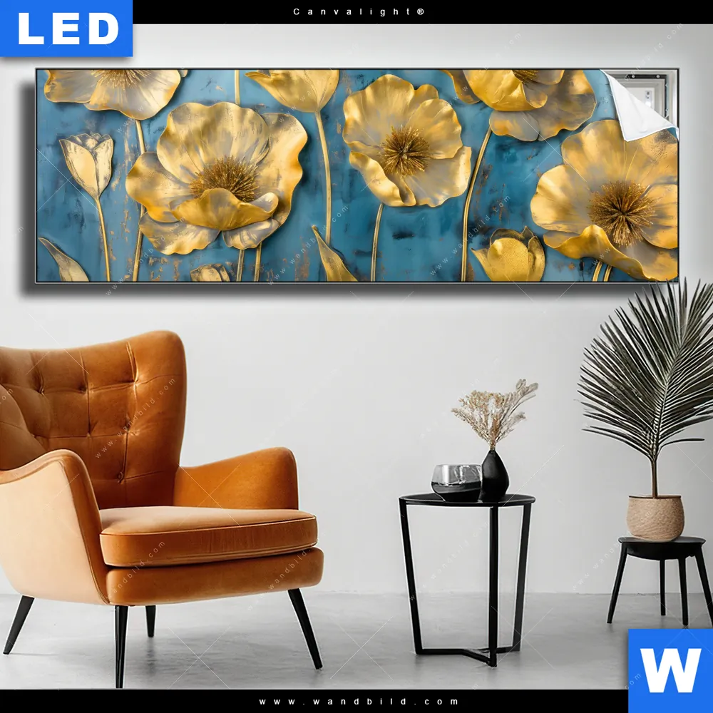 Canvalight® Leuchtbild | Goldene Blumen auf Blau | Panorama