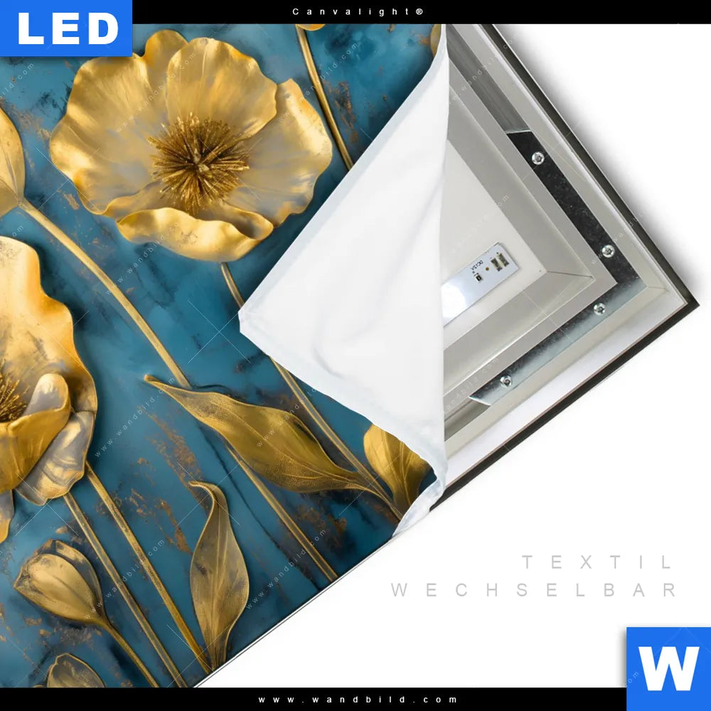 Canvalight® TEX Leuchtbild | Goldene Blumen auf Blau | Quadrat