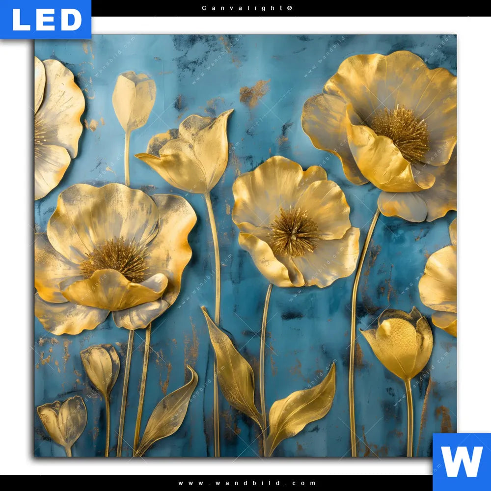 Canvalight® Leuchtbild | Goldene Blumen auf Blau | Quadrat