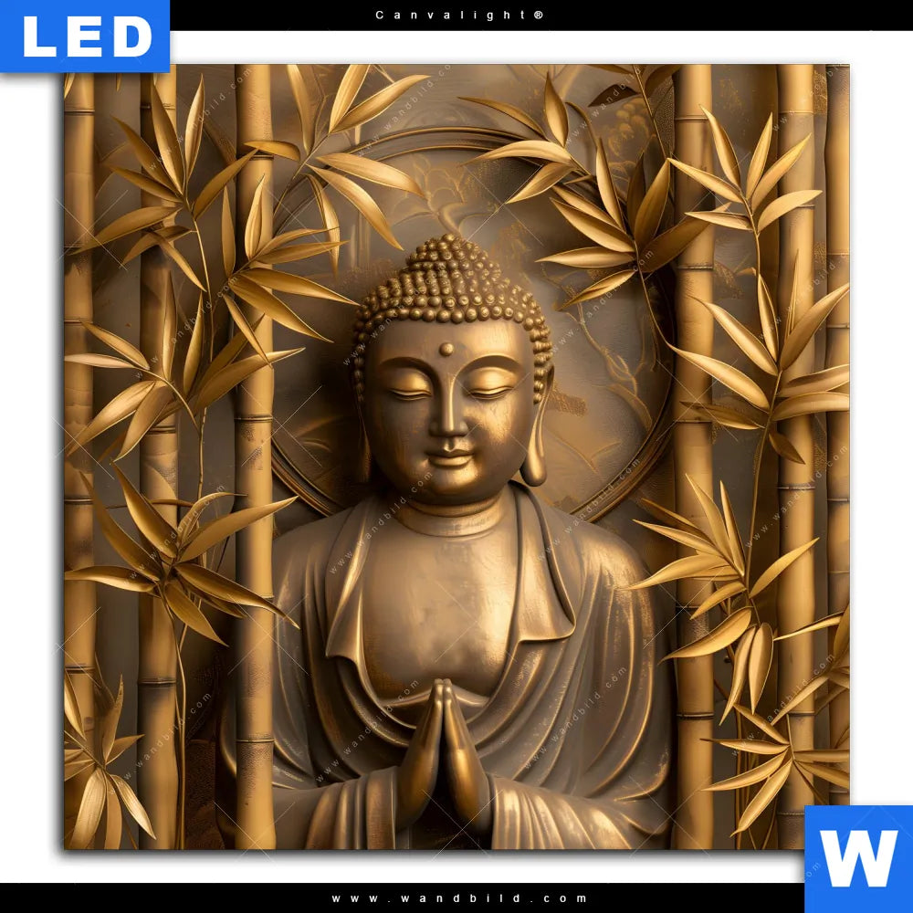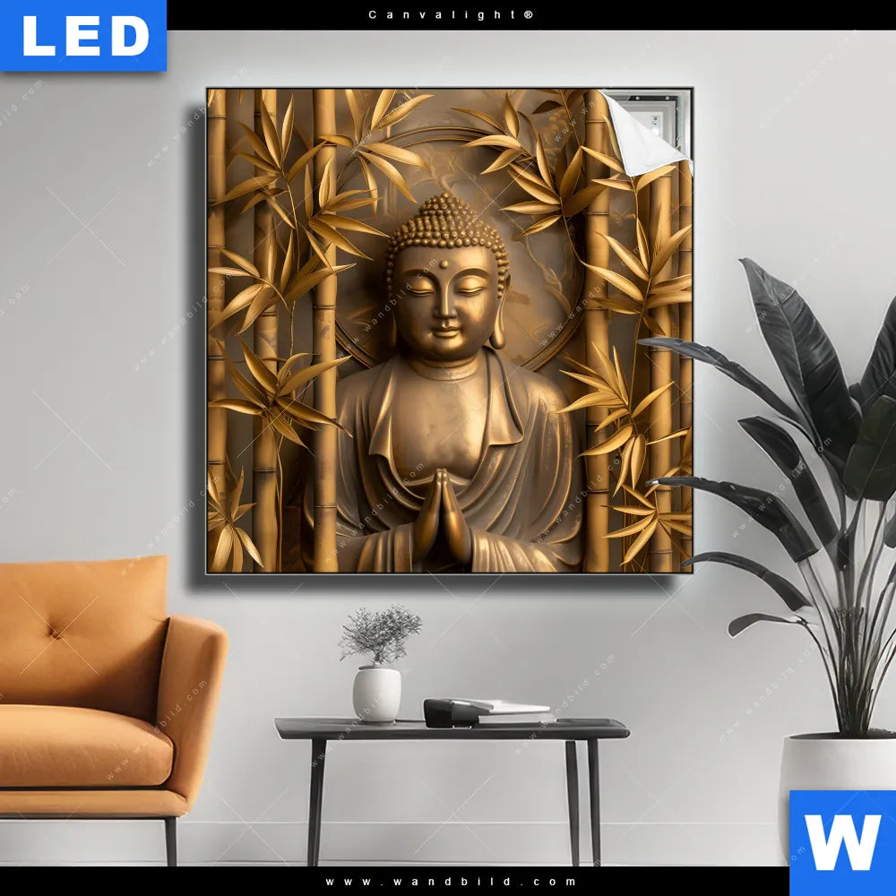 Canvalight® Leuchtbild | Goldener Buddha im Bambuswald | Quadrat