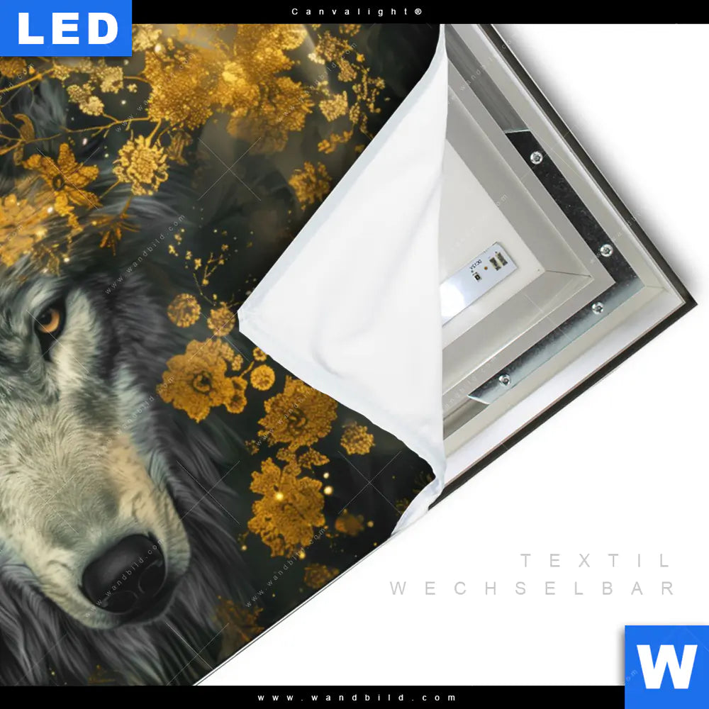 Canvalight® TEX Leuchtbild | Goldener Wolfblick | Querformat