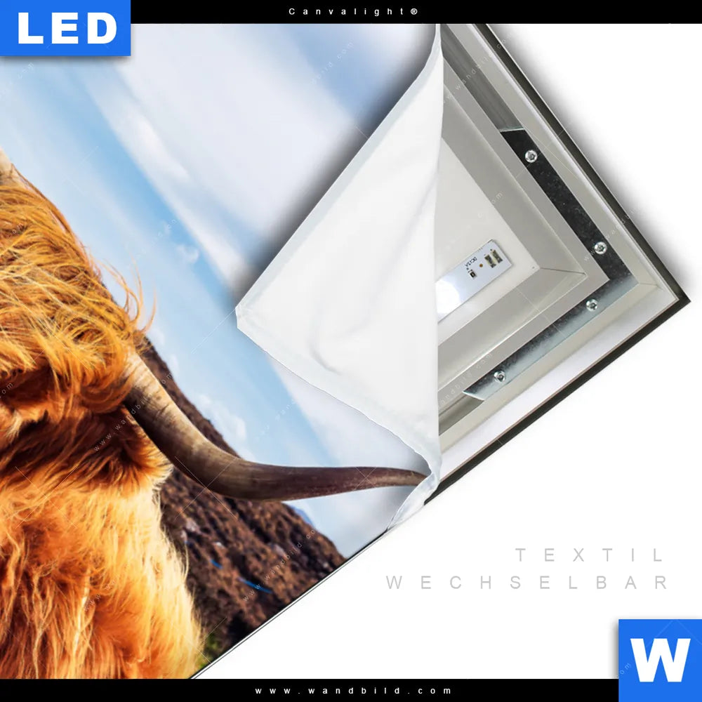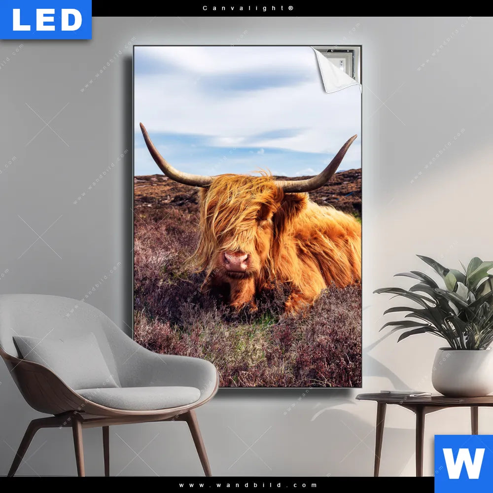 Canvalight® TEX Leuchtbild | Grasendes Hochlandrind | Hochformat