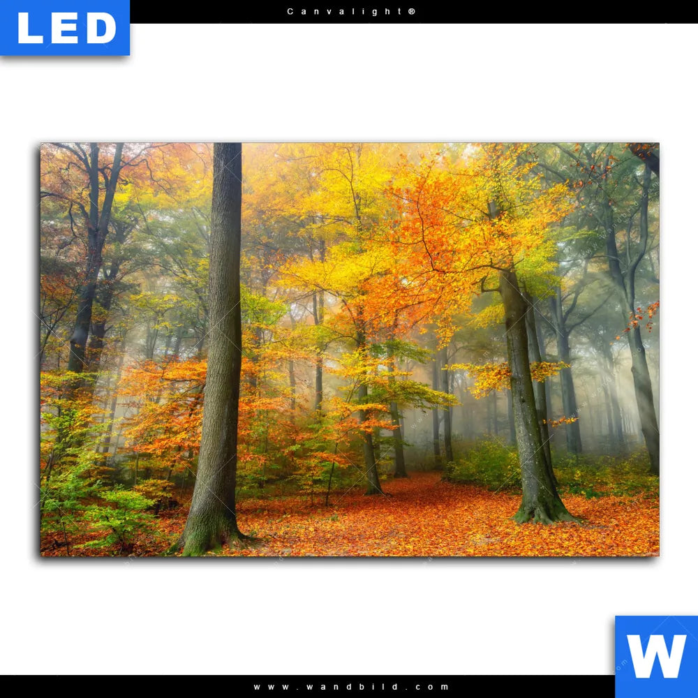 Canvalight® Leuchtbild | Herbstfarben im nebligen Wald | Querformat