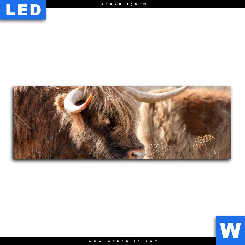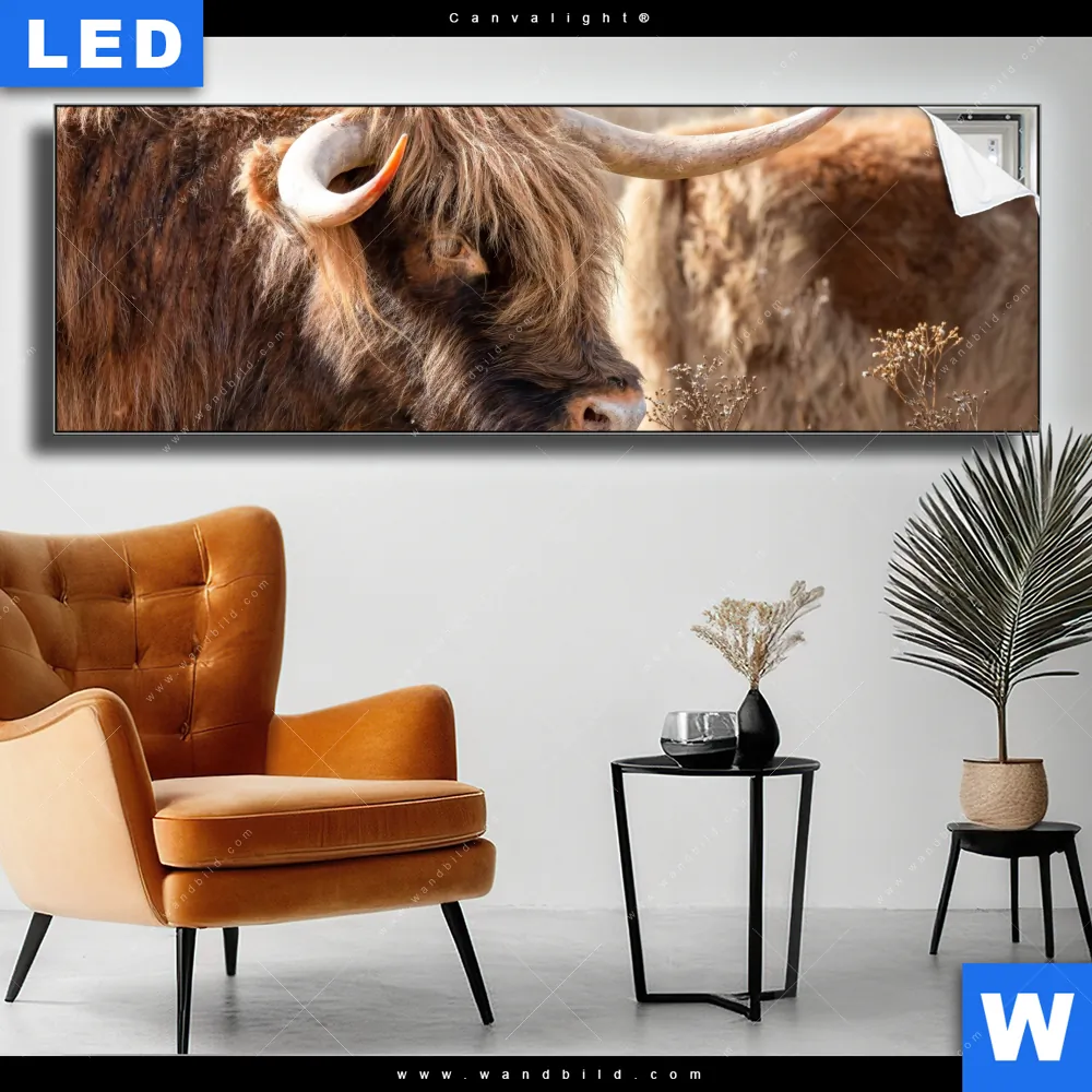 Canvalight® TEX Leuchtbild | Hochlandrind auf Weide | Panorama