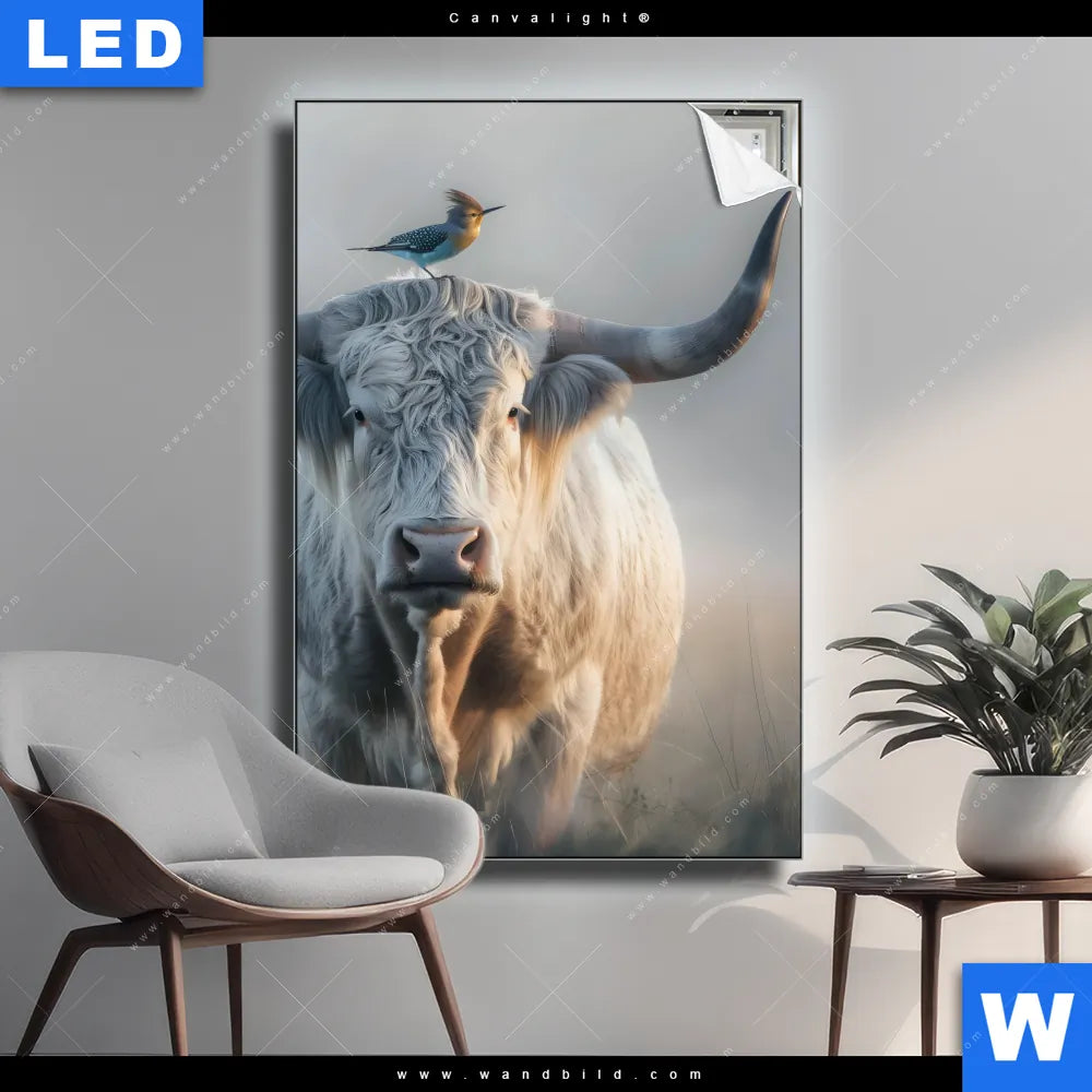 Canvalight® Leuchtbild | Hochlandrind & bunter Vogel | Hochformat