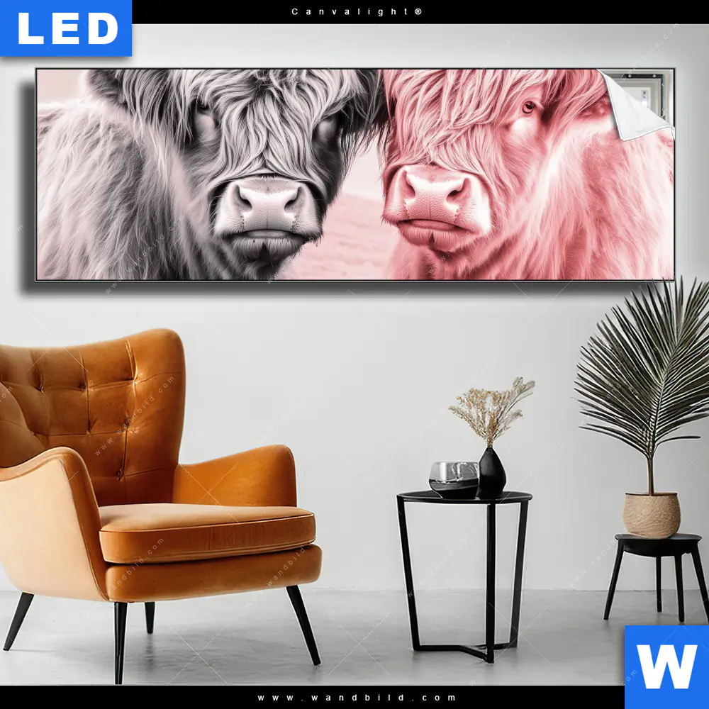 Canvalight® Leuchtbild | Hochlandrinder - Harmonie in Pastell | Panorama